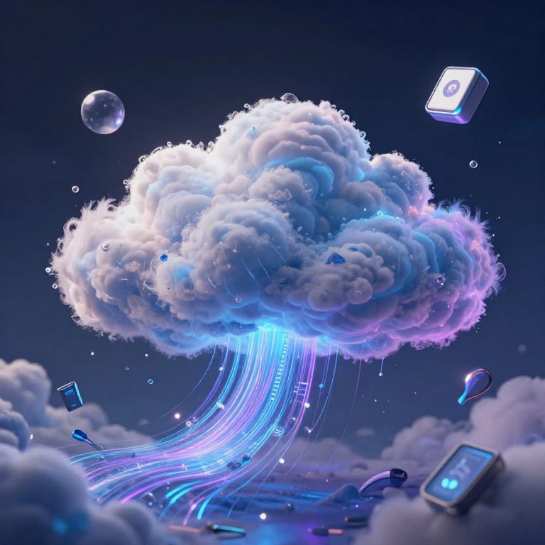 Digital art depicting a glowing, luminescent cloud in a dark blue night sky. The cloud is detailed with fluffy, white and blue-purple hues, emitting vibrant blue light beams that cascade downwards. Surrounding the cloud are floating, cube-shaped devices with glowing screens, and small, translucent bubbles. The scene combines elements of futuristic technology and natural clouds, creating a surreal, cyber-cloudscape. The overall style is highly detailed and vibrant, with a mix of digital and fantasy art influences.