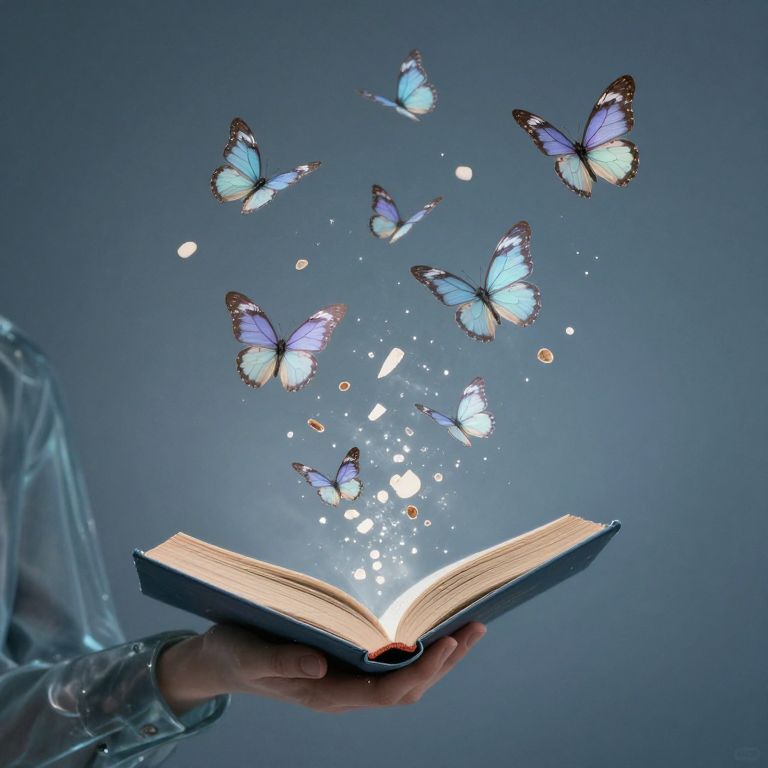 Photograph of a hand holding an open book, with blue butterflies and sparkling particles emerging from the pages against a gradient blue background.