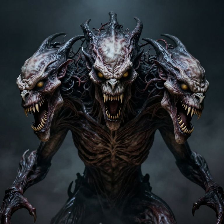 The image depicts a menacing, three-headed creature with a dark, eerie aesthetic. Each head is elongated and twisted, with sharp, jagged teeth bared in a menacing snarl. The eyes are glowing yellow, adding to the ominous atmosphere. The creature's skin is pale and textured, with veins and wrinkles visible, giving it a grotesque appearance. Its body is muscular and sinewy, with arms that appear to be reaching outwards. The background is dark and smoky, enhancing the sense of foreboding and danger. The overall composition is balanced, with the three heads aligned in a triangular formation, creating a sense of symmetry and power. The interplay of light and shadow on the creature's face and body adds depth and dimension to the image, making it appear almost three-dimensional.