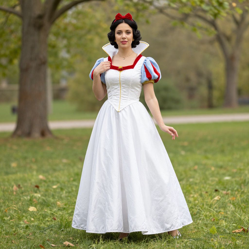 Photograph of a woman in a white Snow White costume with red bow, standing in a lush green park, trees in background.