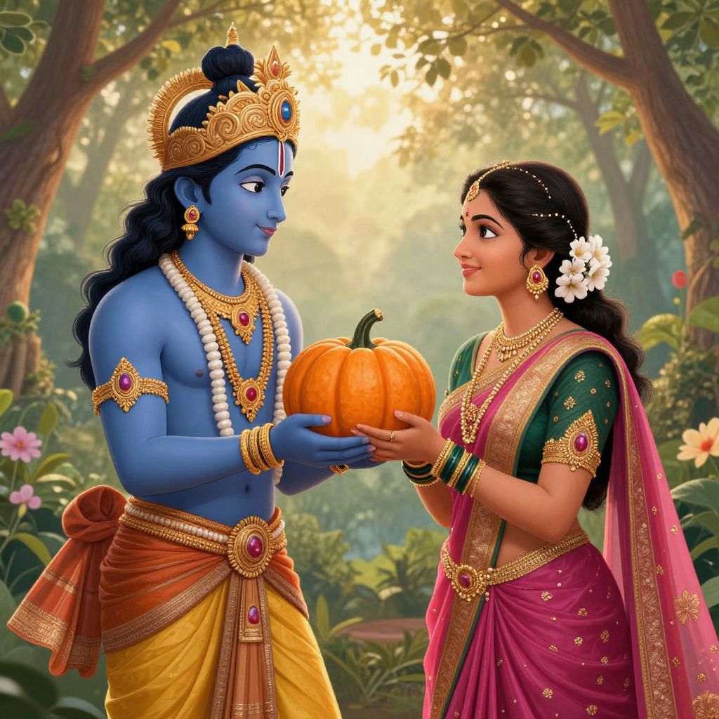 A vibrant digital artwork depicts Lord Krishna, adorned in traditional attire and gold jewelry, offering a pumpkin to a beautifully dressed woman, set against a serene forest backdrop with soft golden-hour lighting and delicate floral accents.