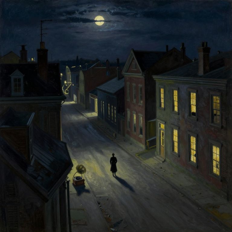 Craft an image reminiscent of Hopper's nocturnal paintings, depicting an isolated street scene under a moonlit sky from a bird's-eye view above the rooftops. A lone figure clad in Victorian attire walks down the deserted road, their silhouette sharply contrasted against the warm light spilling from the windows of forsaken buildings on either side. The haunting ambiance is accentuated by the faint melody of an antique phonograph resonating through the silent night, instilling a profound sense of loneliness and wistfulness within this enigmatic urban tableau.