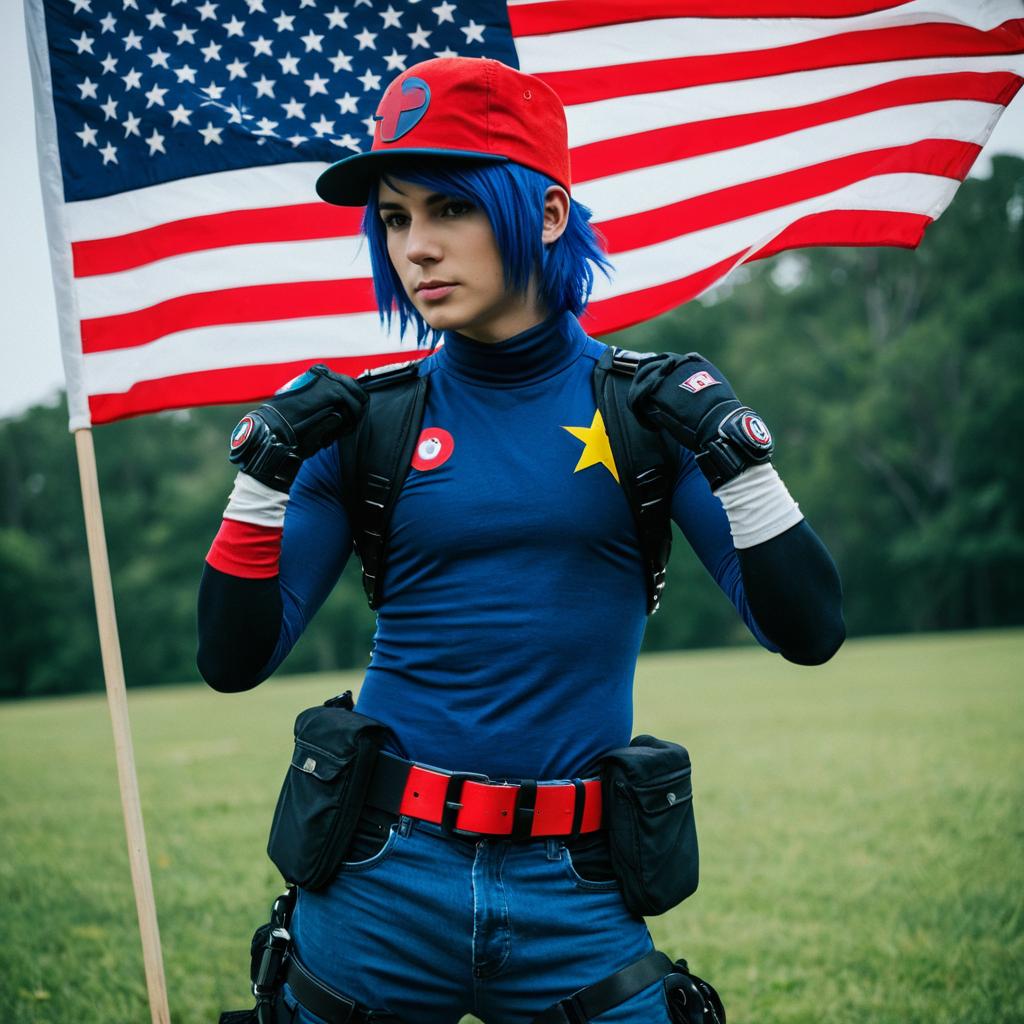 A male cosplayer dressed as Party Poison from the band My Chemical Romance, featuring blue hair, a red cap, fingerless gloves, and a blue shirt with a yellow star, standing outdoors holding a large American flag. The costume includes a red belt, black pants, and tactical-style pouches, set against a blurred natural green background.