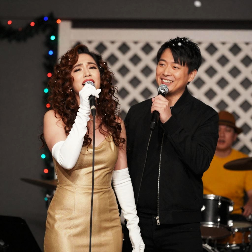 Black and white photo of an Asian male singer dressed in a dark suit and bow tie, holding a microphone on stage. The singer is illuminated with a slight smile, standing in front of a blurred background featuring a band with visible drums and another male musician. The setting is a dimly lit concert stage.