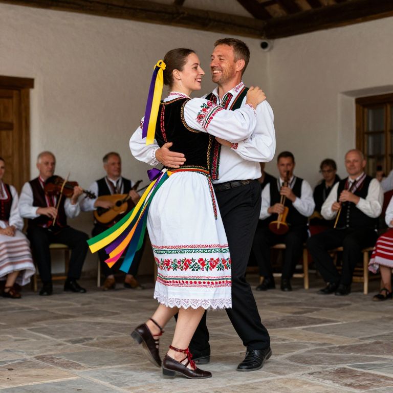 Photograph of a dancing couple in traditional folk attire. The woman, with dark hair in a bun, wears a white embroidered dress with black vest and colorful ribbons, black shoes, and red socks. The man, with short brown hair and a beard, wears a white shirt, black vest, black pants, and black shoes. They are smiling and embracing in a waltz-like position. Background shows a group of men in similar traditional outfits sitting and clapping, with wooden doors and white walls. The stone-tiled floor adds rustic charm. The image exudes joy and cultural celebration.