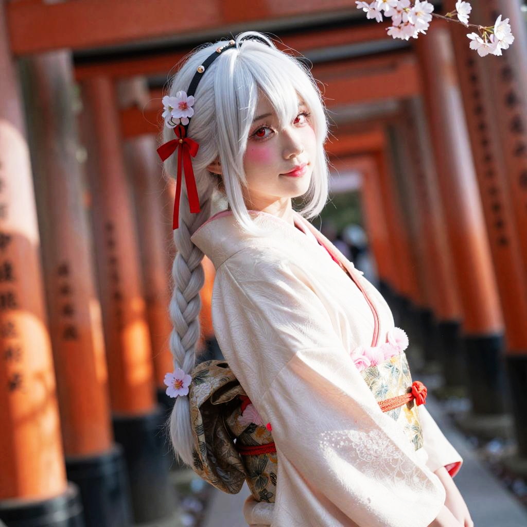 Photograph of a pale-skinned woman with white hair in a black kimono with floral patterns, gold obi, walking down a sunlit,