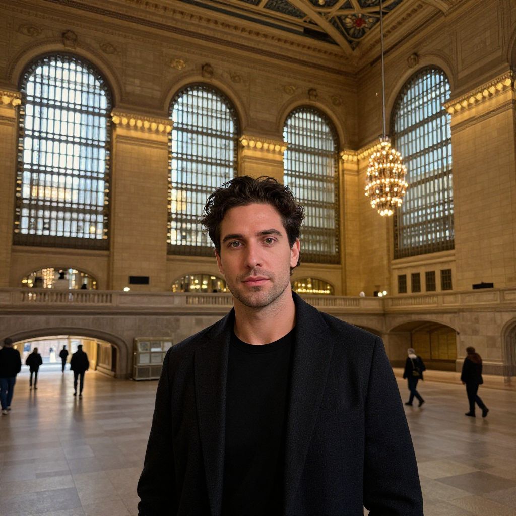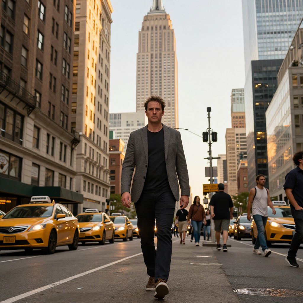 Urban landscape: A man stands amidst a busy city scene, bathed in warm golden hour light, surrounded by eclectic mix of modern skyscrapers, historic buildings, and colorful street vendors. Vibrant market stalls filled with exotic goods, people from all walks of life, bustling streets, urban energy, diverse architecture, rich cultural heritage, mixed economy. Man has masculine face and piercing eyes