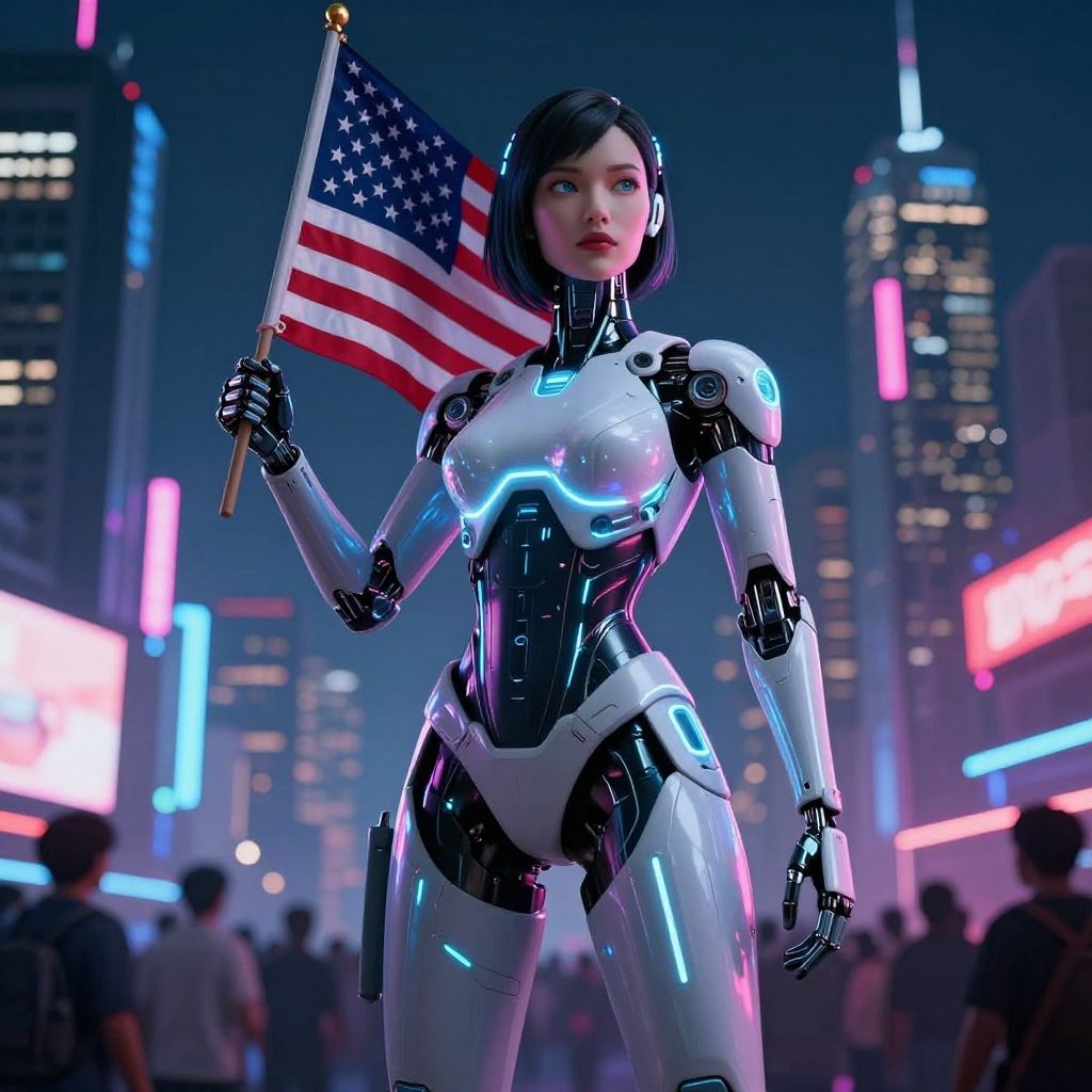 A high-quality 3D render of a female android wearing a sleek, glowing futuristic bodysuit, holding an American flag. The android stands prominently in a neon-lit cityscape at night, with crowd silhouettes and illuminated skyscrapers in the background, creating a striking cyberpunk atmosphere.