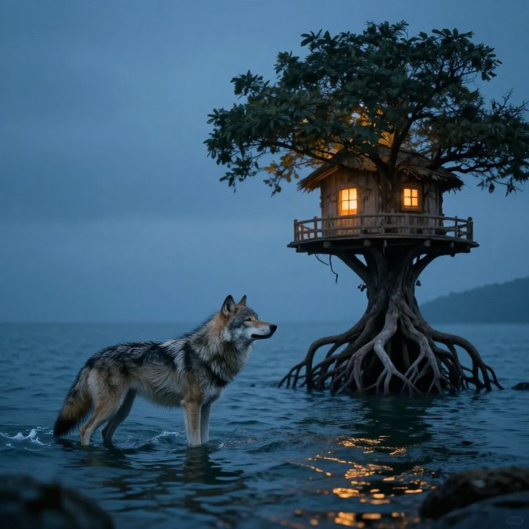In a surreal realm where the boundaries of land and sea blur, a wolf woven from the depths hums a lullaby that echoes through the quiet waters, casting a spell of serenity over the ocean while guarding the warmth of a glowing treehouse perched on ancient roots, symbolizing the delicate balance between life's fragility and enduring hope.