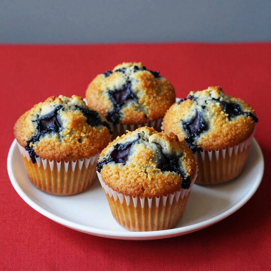 Photograph of three golden-brown muffins with dark blueberry swirls, sitting on a white plate. The muffins have a slightly uneven, crispy top and are nestled in ridged paper cups. The background is a vibrant red fabric with a gray border on top and bottom, adding a warm, cozy feel to the image. The lighting highlights the muffins' texture and color.