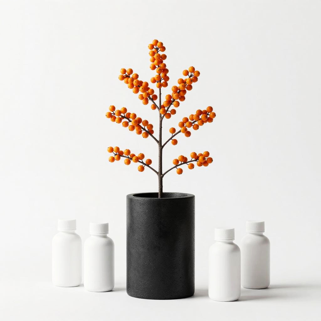 A clean flat color artwork featuring a matte black concrete cylinder holding a short branch with bright orange berries, on a seamless white background with three small empty white bottles nearby; high contrast, bold accent colors, thin clean lines, balanced composition, generous negative space, soft studio lighting, modern minimalist aesthetic, crisp edges, no text, no watermark