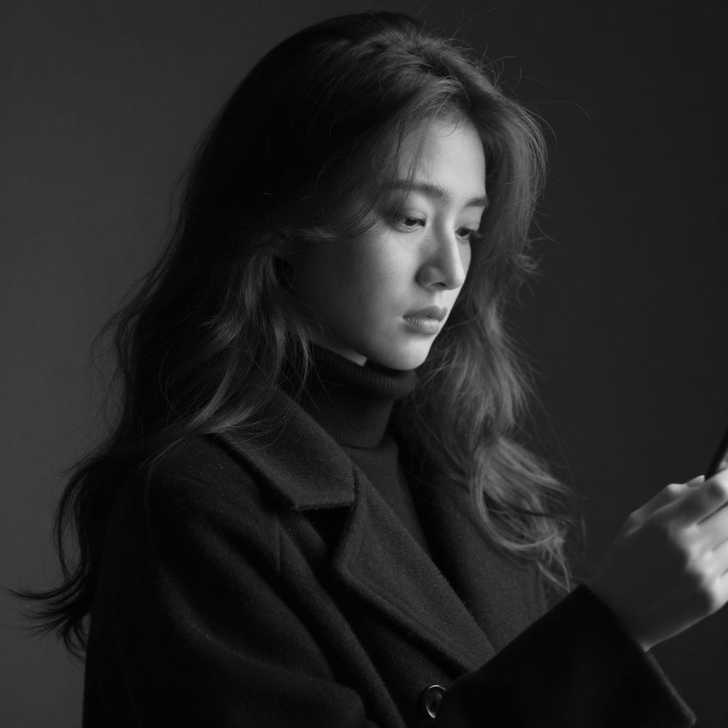 Black-and-white photograph of a young woman with long, wavy hair, gazing downward. She wears a dark, high-collared coat, and her face is illuminated by a dramatic light source from the right. Her expression is contemplative, and her hand is partially visible, holding an object near her face. The background is dark and ured.
