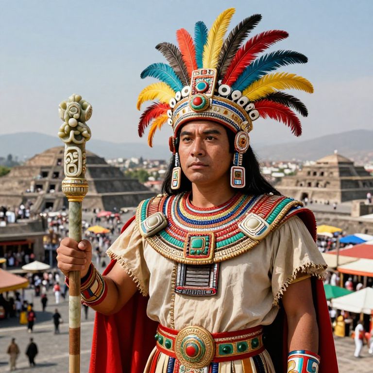Moctezuma, regal Aztec ruler portrayed in traditional noble attire with colorful feathered headdress, holding a carved obsidian staff, set against the backdrop of Tenochtitlan cityscape with temples and bustling marketplace, vivid colors and soft lighting.