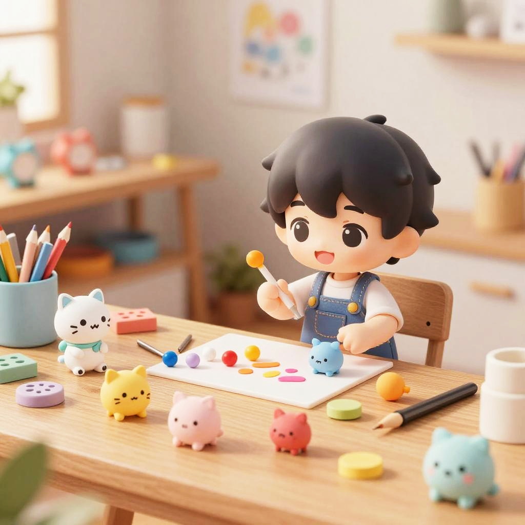 Chibi maker scene featuring tiny chibi characters crafting and assembling cute miniatures, bright studio environment filled with art supplies and tools, pastel colors, lively expressions, detailed small props, cozy creative atmosphere, high detail digital illustration