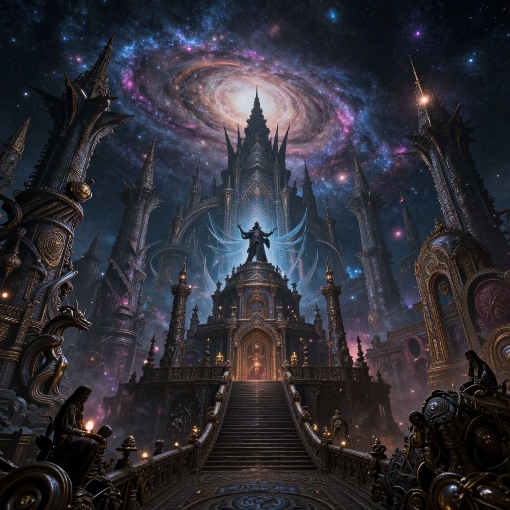Digital fantasy artwork depicting a grand, gothic-style castle under a swirling, galaxy-like sky with bright stars and a luminous central core. A heroic figure with wings stands at the castle's peak, silhouetted against the celestial backdrop. The castle has intricate, spire-topped architecture with glowing windows and ornate details. A central staircase leads up to the entrance, flanked by dark, metallic sculptures. The foreground includes shadowy figures and mist, adding a mysterious atmosphere. The color palette combines dark blues, purples, and blacks with vibrant celestial hues, creating a dramatic, otherworldly scene.