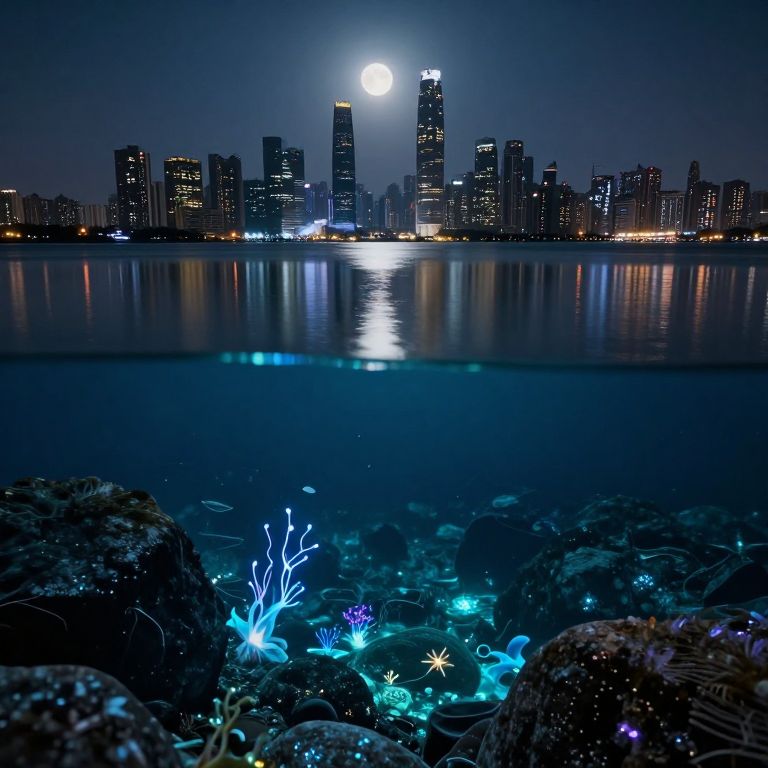 Photograph of a nighttime cityscape with a full moon shining brightly over a skyline of tall, illuminated skyscrapers. The lower half of the image shows the underwater view of a rocky seabed, illuminated by vibrant blue and purple bioluminescent marine life, including glowing coral and starfish. The calm water above reflects the city lights and moon, creating a serene contrast between the dark, urban background and the colorful, illuminated underwater scene. The image captures a split perspective, blending urban and underwater elements.