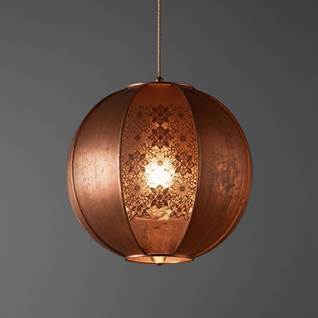 Early Renaissance Art Describe the image of the Flos Skygarden 2 hanging light in copper color. The light is suspended from the ceiling by a cord and has a spherical shape with a diameter of approximately 535 pixels. The shade of the light has a ribbed texture and features intricate floral patterns on its interior surface. The light source is not visible, but appears to be positioned at the top of the shade, casting a warm and diffuse glow downwards. Provide a detailed description of the visual features and characteristics of the Flos Skygarden 1 hanging light in , using natural language,