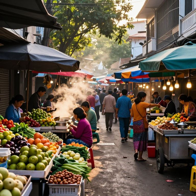 Vietnamese street market at dawn, vibrant stalls filled with fresh fruits, vegetables, and traditional dishes, bustling crowd in colorful attire, narrow alleyways, steam rising from food carts, warm golden sunlight filtering through trees, a lively urban atmosphere