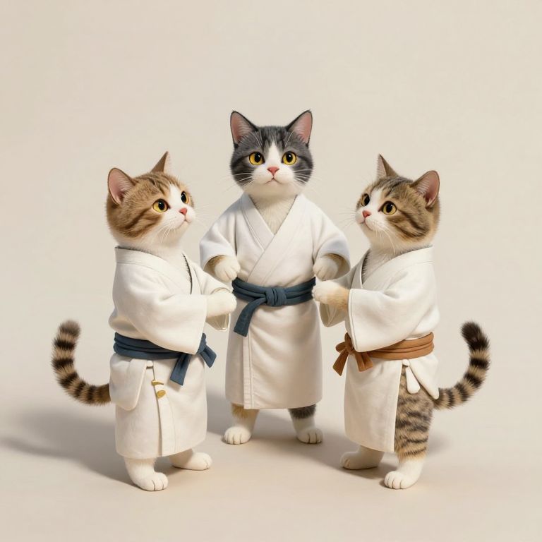 Photograph of three anthropomorphic cats in white karate gis with blue, brown, and no belts, standing and facing each other.