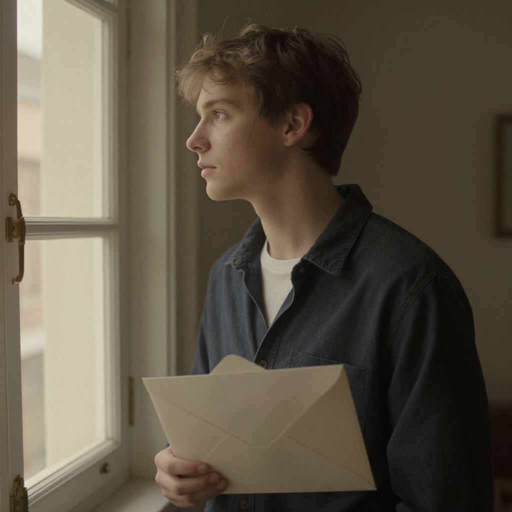 Enveloped in the soft glow of vintage light, a young man stands by his window, his gaze fixed outward, embodying a quiet contemplation of freedom and the unspoken yearning for what lies beyond.