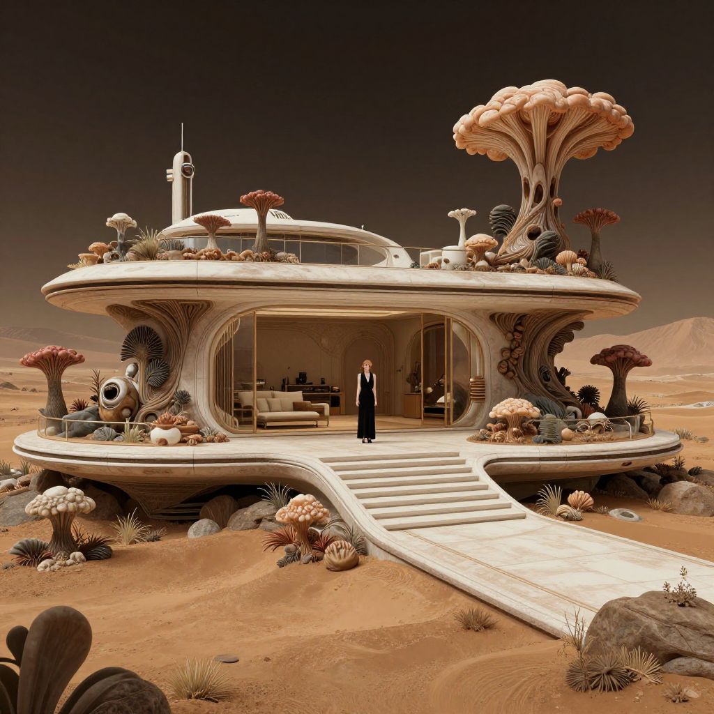 Fashion Editor sci-fi landscape, a futuristic villa on planet Mars with the external porch full of alien fungus potts, highly detailed and elegant composition, intricate detail,