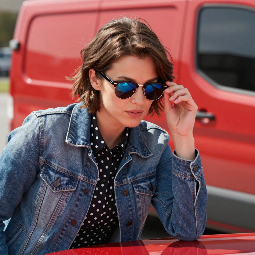 Woman with short brown hair, wearing a denim jacket and polka dot shirt, leaning over a red car, adjusting reflective sunglasses with her right hand. Background has a red van. Bright outdoor lighting. Woman has focused expression.