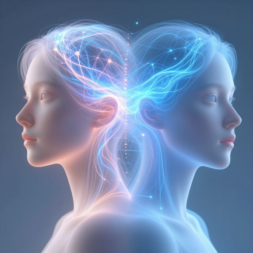 Digital artwork of a dual-profile female head with glowing blue and white neural networks intertwining, set against a dark blue background.