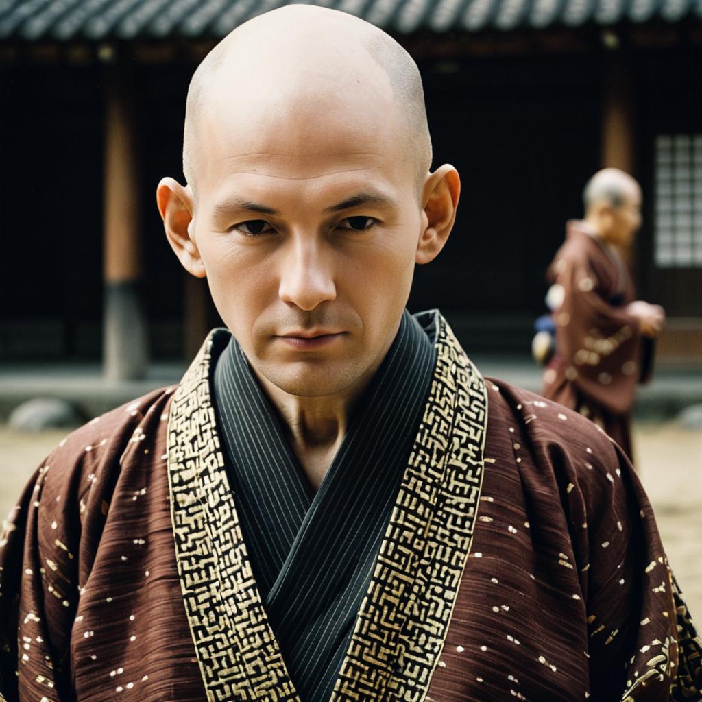 Close-up portrait of a bald East Asian man wearing a detailed brown kimono with a patterned collar. The man has pointed ears and a serious expression, standing outdoors in front of a traditional Japanese building. Another elderly man in similar attire is visible blurred in the background.