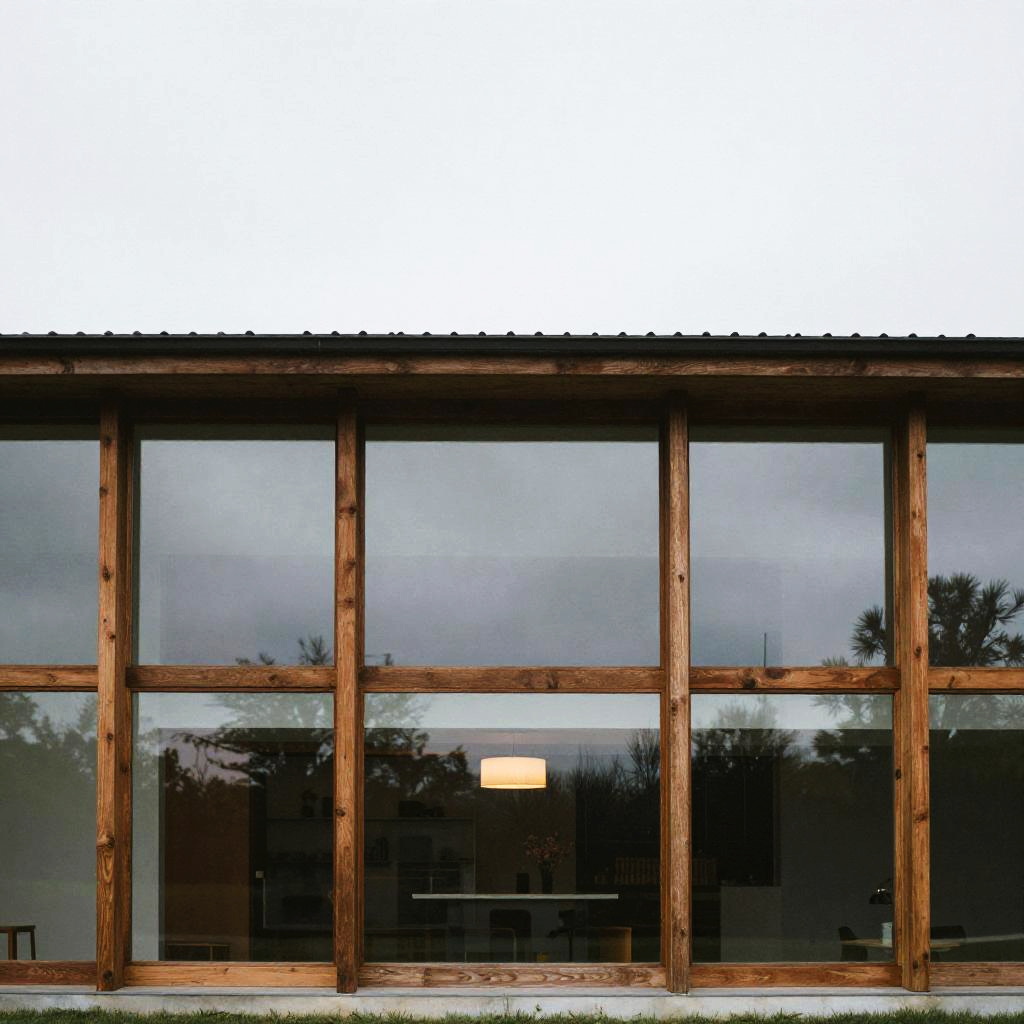 RAW photo, exterior frontal shot, building, straight precise lines, white sky, (diffused light:1), (big reflective glass windows), wood frames, minimalist style, fog, (warm interior light:1), hyper realistic, super detailed, 8k, Nikon Z6 Mirrorless Camera, film grain