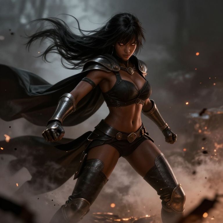 Digital artwork of a fierce, dark-skinned warrior woman with glowing orange eyes and long, flowing black hair. She wears a black leather bra, matching arm guards, and a flowing black cape, with silver armor on her shoulders, forearms, and shins. Her muscular, toned body is highlighted by the dramatic lighting. She stands in a battle-ready stance amid a smoky, fiery background with floating embers. The image has a high-contrast, fantasy-style aesthetic with intense lighting and dynamic motion, emphasizing her powerful presence and determination.