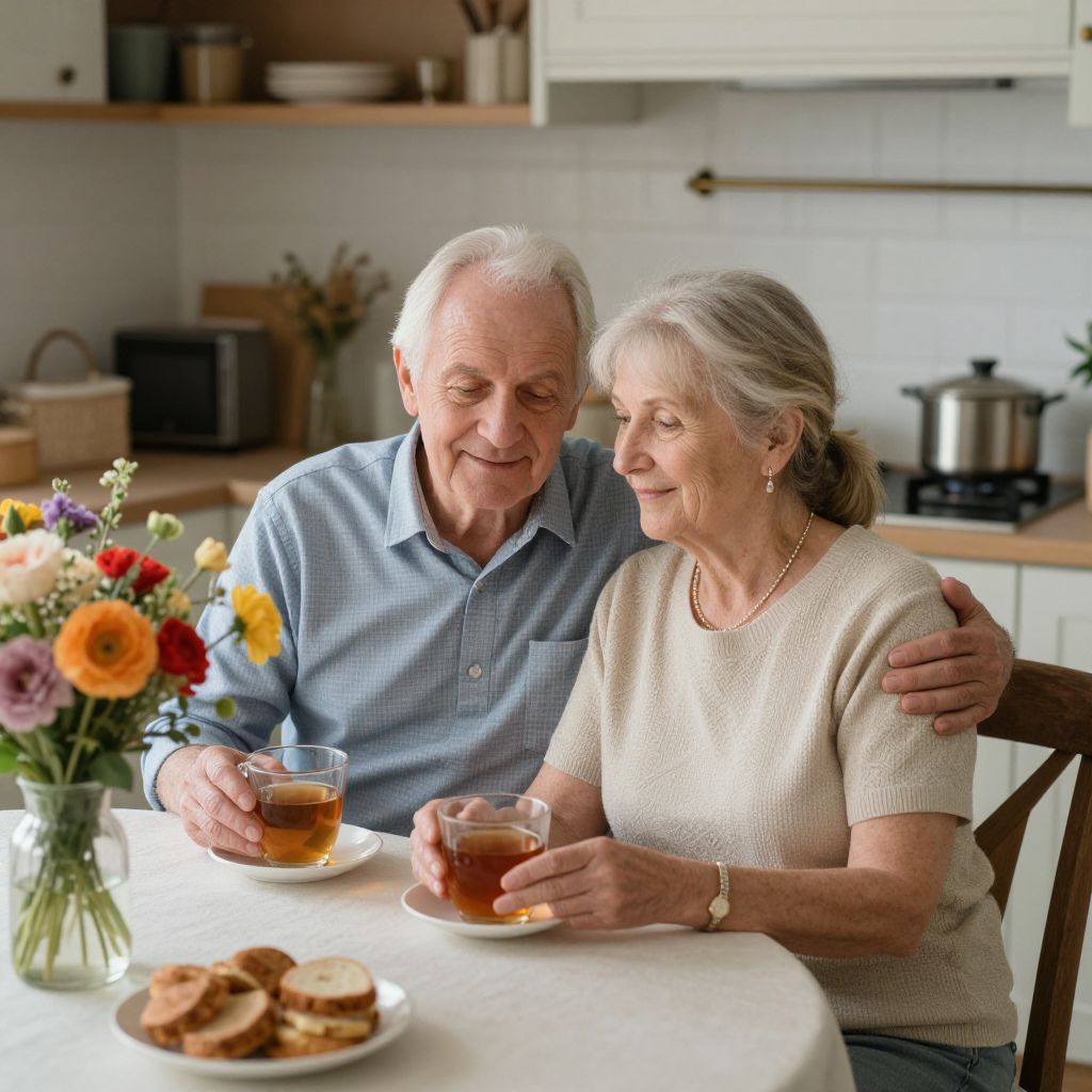 Calmly seated at a cozy kitchen table, an elderly couple shares a warm moment, with the man gently embracing the woman as they enjoy a cup of tea and a vibrant floral arrangement in the foreground.