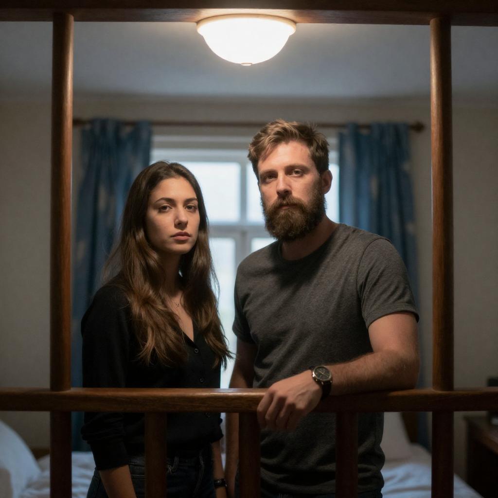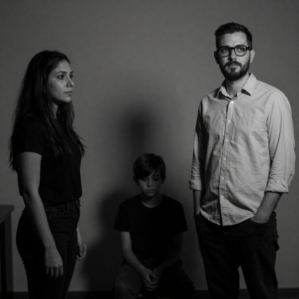 Black-and-white photograph of three people in a dimly lit room. On the left, a woman with long dark hair stands in shadow. In the center, a child with short hair sits, partially obscured. On the right, a man with glasses and a beard, wearing a button-up shirt, stands with his hands in his pockets.