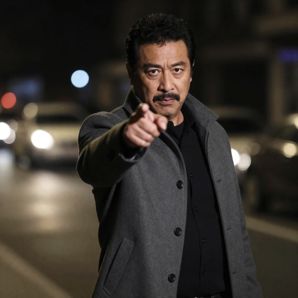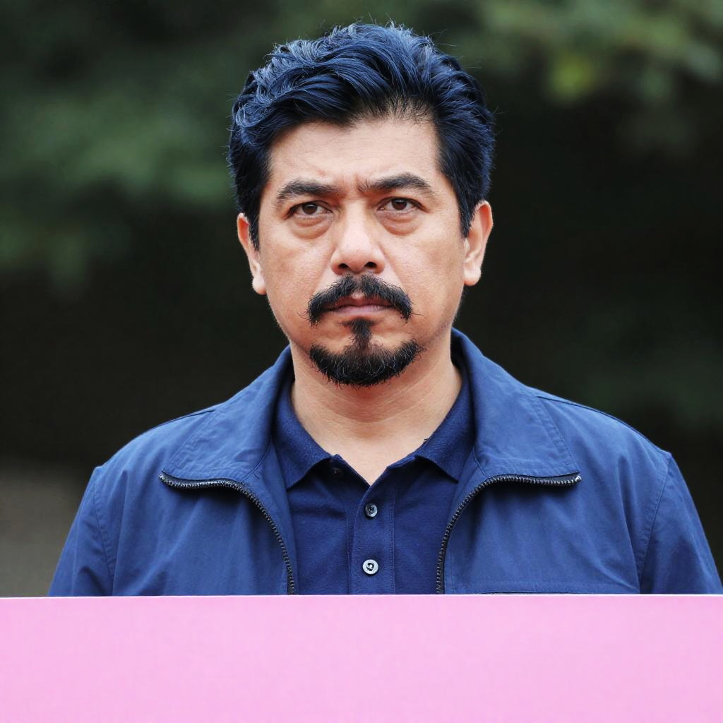 Photograph of a middle-aged man with dark blue-styled hair and a black mustache and goatee, wearing a blue shirt and jacket. He has a serious expression, looking slightly to the right. A bright pink sign is in front of him. Background includes greenery.