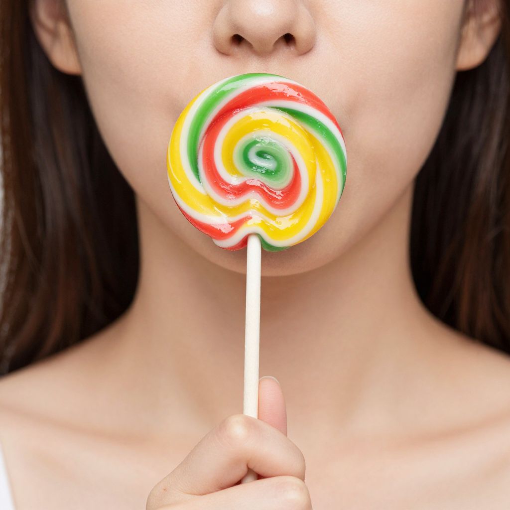 Close up photo of woman holding lollipop