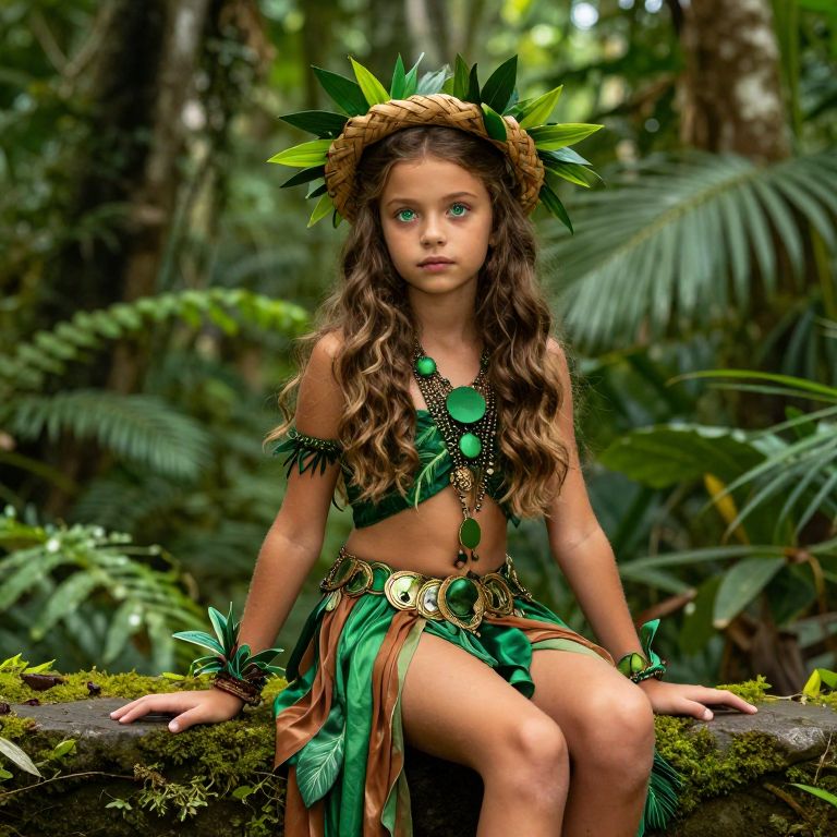 Photograph of a young girl with long, wavy brown hair, sitting on a moss-covered stone in a lush, green jungle. She wears a leafy, green and brown tribal costume with a crown of large green leaves, and a necklace adorned with green beads. Her outfit has a leafy skirt with brown and green stripes, and she has matching leaf bracelets. Her skin is light, and her eyes are a striking blue. The background is filled with dense, tropical foliage, including large leaves and vines, creating a vibrant, natural setting. The image has a high-contrast, vibrant style.