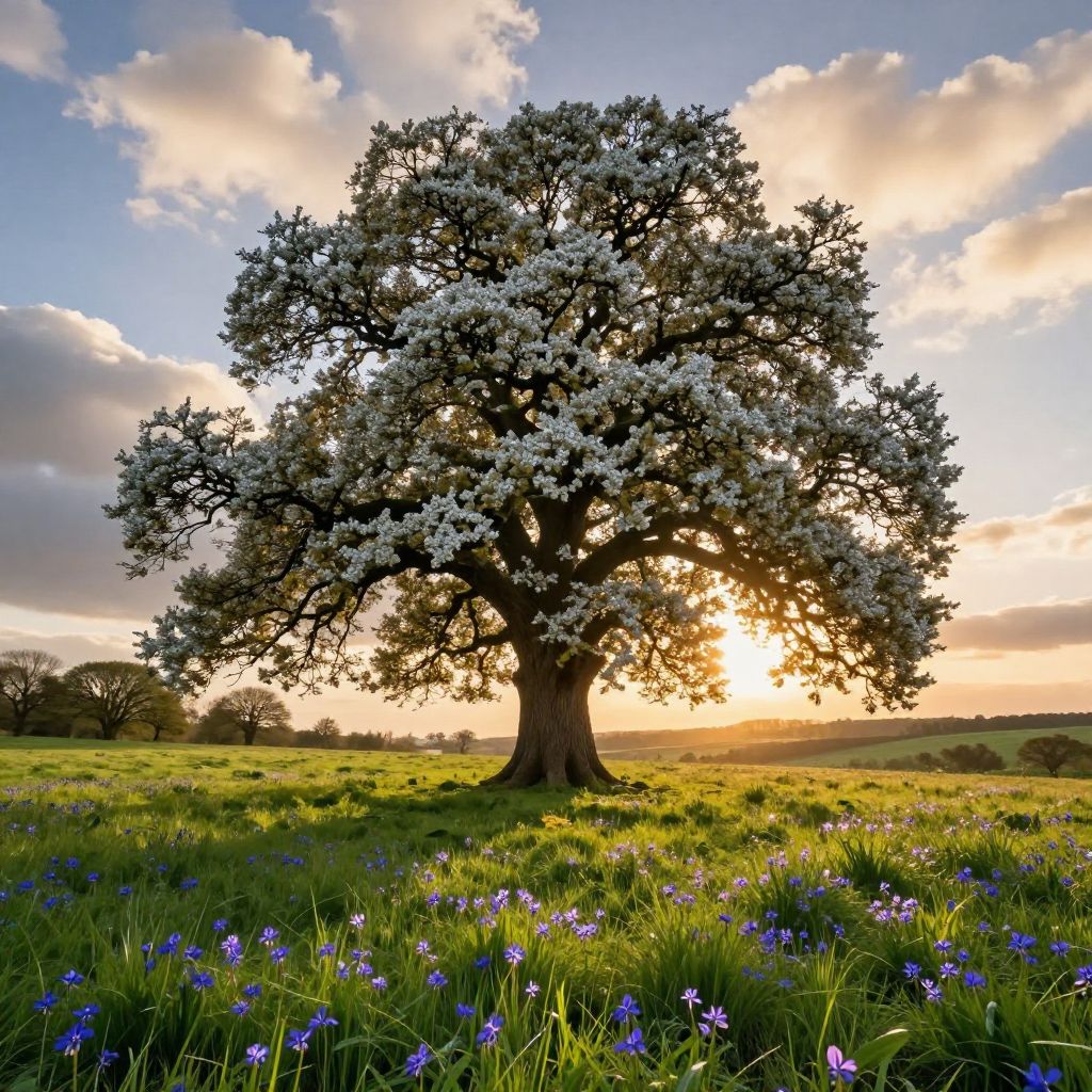 A majestic ancient oak tree adorned with silver flowers stands prominently in a lush, green meadow. The vibrant grass is dotted with radiant sapphire-like flowers, illuminated by the golden hues of a sunset sky filled with fluffy white clouds. Distant trees and rolling hills complete this enchanting natural landscape.