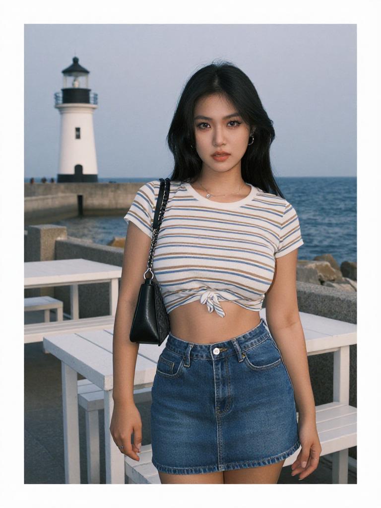 Photograph of an Asian woman with long black hair standing outdoors at a coastal lighthouse. She wears a white, short-sleeved, striped crop top tied at the front, revealing her midriff, and a high-waisted, blue denim mini skirt. She carries a black handbag on her right shoulder. Behind her, a white lighthouse with a black top stands on a stone pier, overlooking a calm ocean. White benches are in the foreground. The sky is clear with a subtle blue hue. The woman's expression is neutral, and she stands centered in the frame.