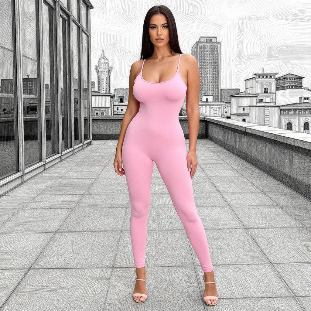 Digital illustration of a curvy woman with long black hair, wearing a tight pink jumpsuit and sandals, standing on a rooftop against a black-and-white