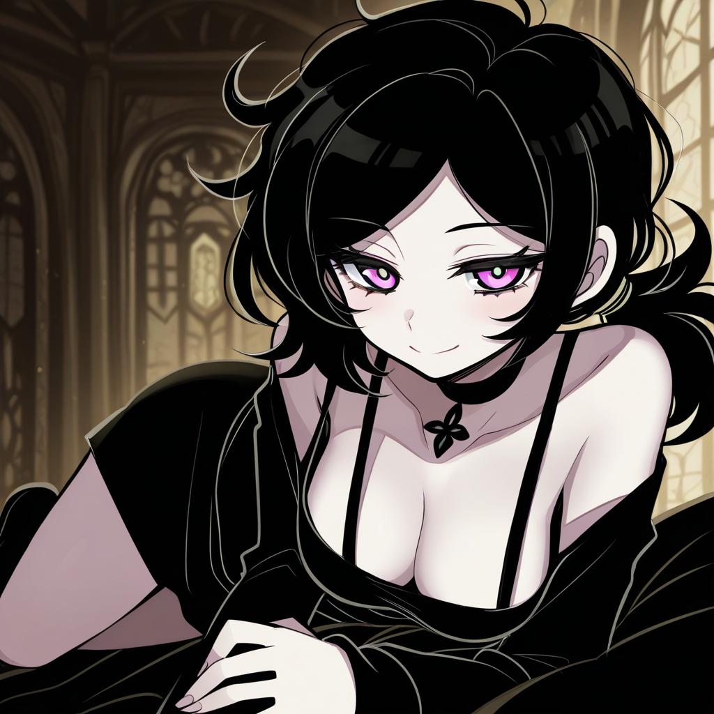 Ashley graves, the coffin of andy and leyley, 1girl, pink eyes, purple eyes, black hair, messy hair, ponytail, medium breasts, cleavage, black choker, by artist ichirugi, illustrious