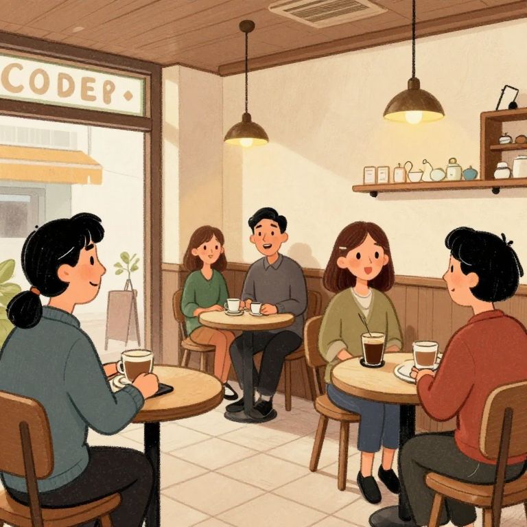 Digital illustration of a cozy café with warm lighting. Five people, three women and two men, sit at round wooden tables with small white cups and saucers. The woman on the left wears a blue sweater and has black hair in a ponytail, facing the group. The man next to her wears a gray sweater. A woman in a green sweater and brown hair sits across from them, while another woman with dark brown hair in a green top sits beside the man in a red sweater. Background features wooden paneling, hanging lamps, and a shelf with small jars and cups. A window with a "CODE" sign is on the left.