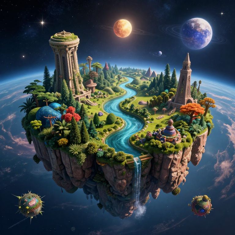 Wrold depicted as a surreal floating island in space, vibrant ecosystems with lush forests, rivers flowing into the abyss, mysterious ancient ruins, radiant celestial bodies illuminating the scene, fantasy and sci-fi elements blended seamlessly
