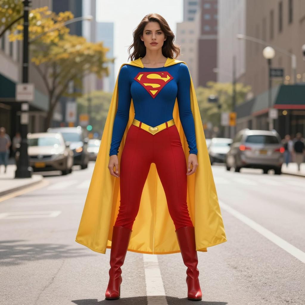 Superhero capes bulk costume, photo of a woman standing in the middle of a city street, wearing a Supergirl costume, blue and red bodysuit with yellow cape, red boots, long brown hair, urban background, daytime, sunlight, trees with yellow leaves, buildings on both sides, realistic style, CGI, clear focus, full body, frontal view, confident pose