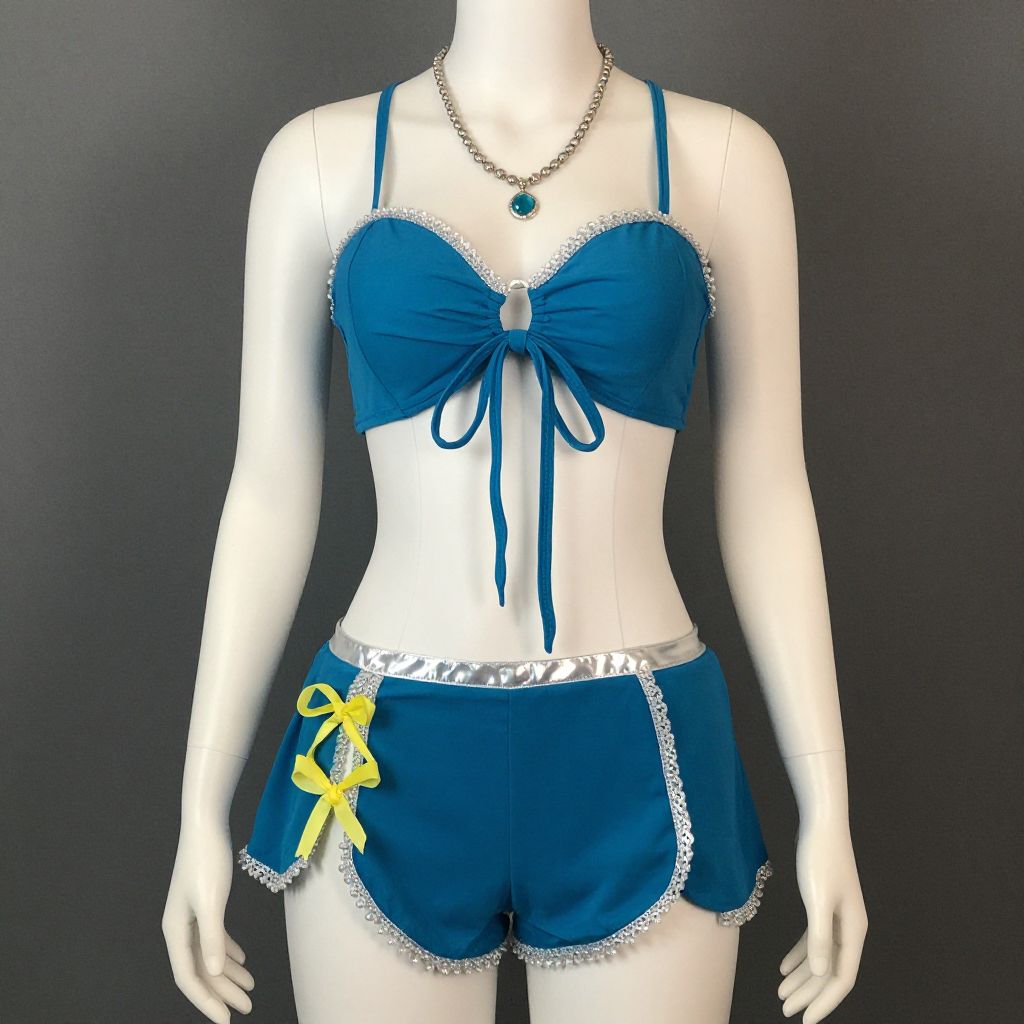Photograph of a white mannequin wearing a blue bikini set with white lace trim, yellow ankh bow on shorts, and a turquoise necklace against