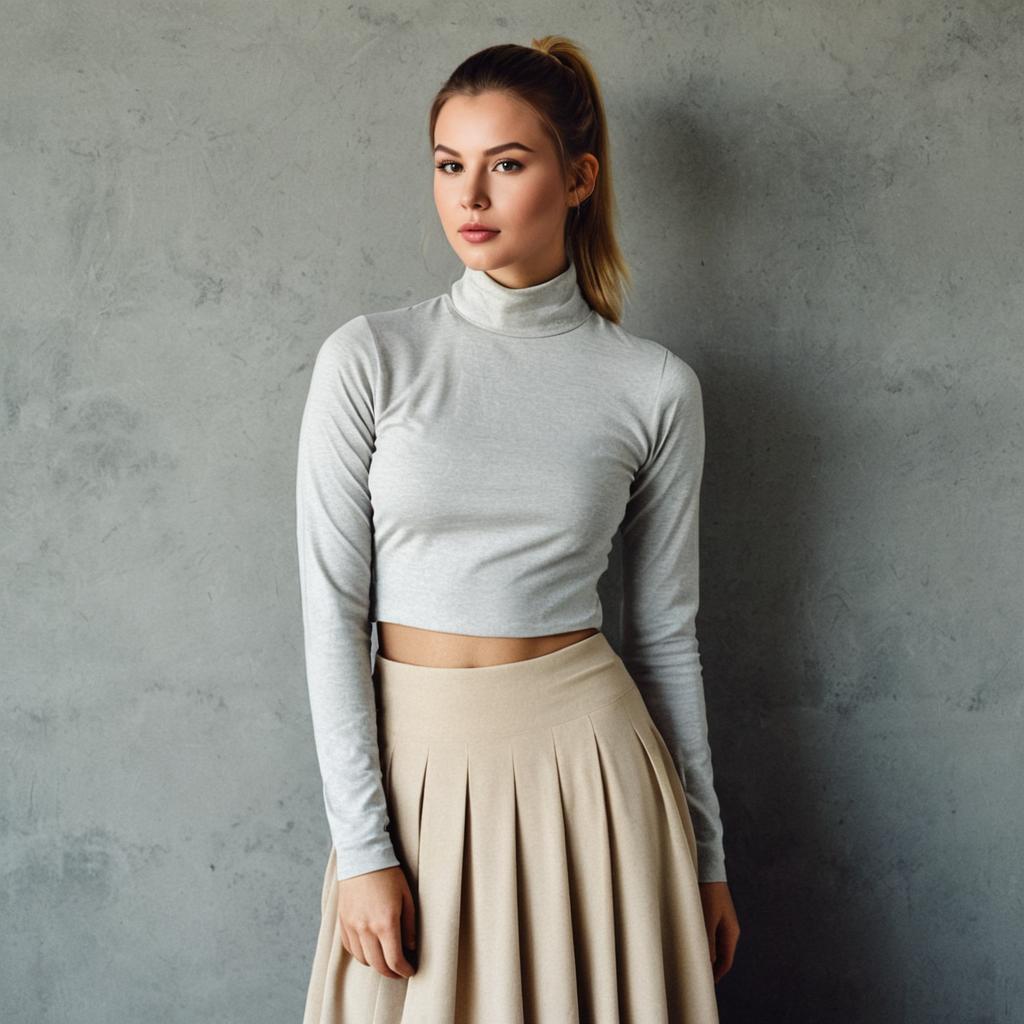 Photorealistic portrait of a young woman standing against a textured grey wall. She is wearing a light grey long-sleeve, high-collar crop top paired with a beige high-waisted pleated skirt. Her hair is styled in a ponytail, and she has a neutral expression. The image features soft natural lighting and a simple background, emphasizing her casual yet elegant modern fashion style.
