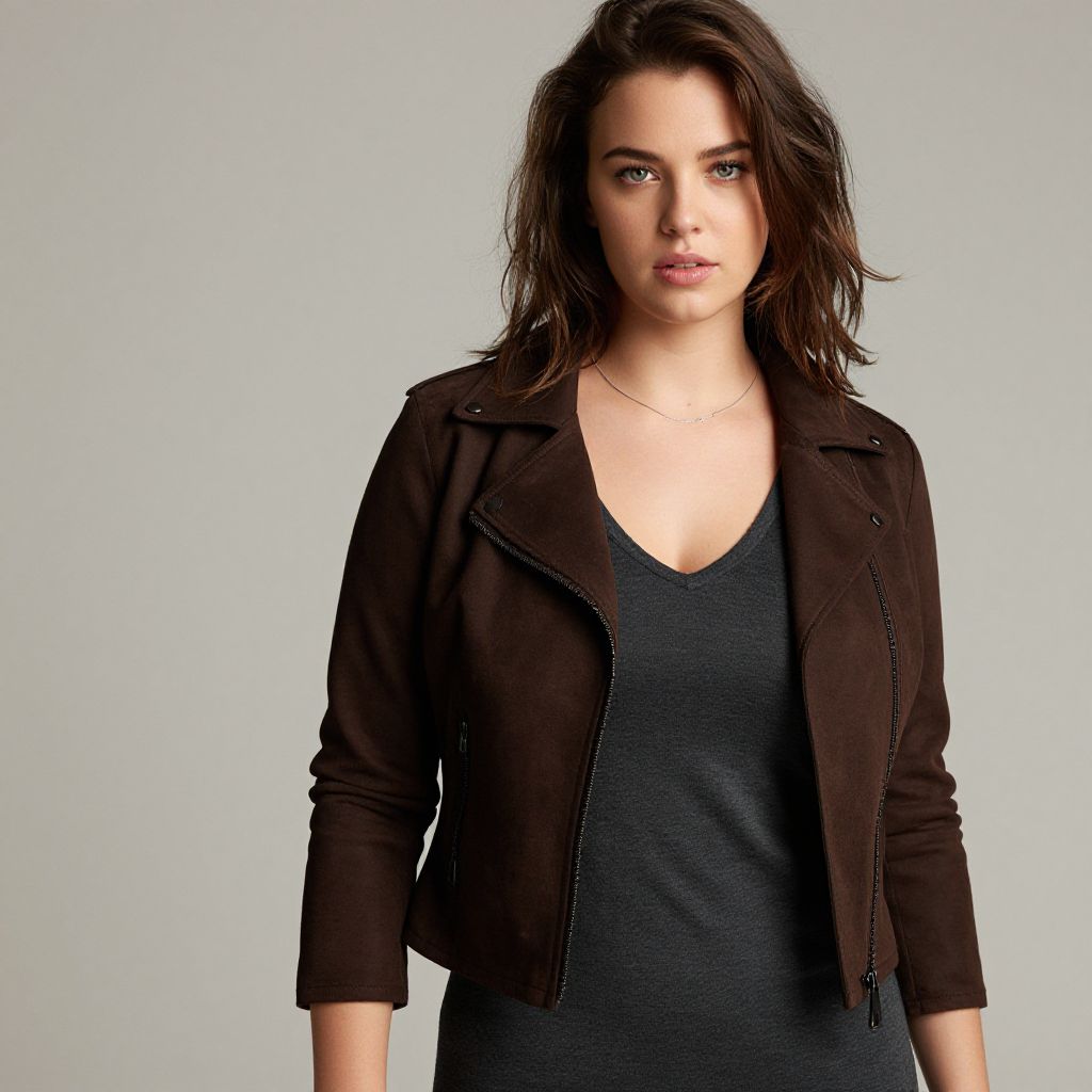 "Woman, casual chic, fitted suede biker jacket in dark brown, asymmetrical zip closure, zipper accents, three-quarter sleeves, charcoal grey V-neck T-shirt dress, minimal jewelry with delicate silver necklace, natural makeup, tousled beachy hairstyle, studio background with neutral tones.. Sexy. Pretty face and beаutiful eyes. Big breasts."