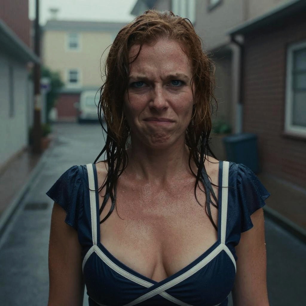 Analog style masterpiece, a close up portrait of a (sexy:1.2) ((wet)), annoyed looking, chestnut colored hair, 40 yo, teacher, wearing a wet (dark blue) dress with white geometric accent, braless, ((milf)), blue eyes, (((wet hair))), standing on a rainy street, alleyway, natural breasts, ((small breasts)), cleavage, sexy smirk, getting wet, sweaty, embarrassed, (nose freckles:.8), hotel in the background, slate atmosphere, foggy, cinematic, dimmed colors, dark shot, blue grey colors, muted colors, film grain, fil noir style, insane details, intricate details, skin imperfections, sagbobz