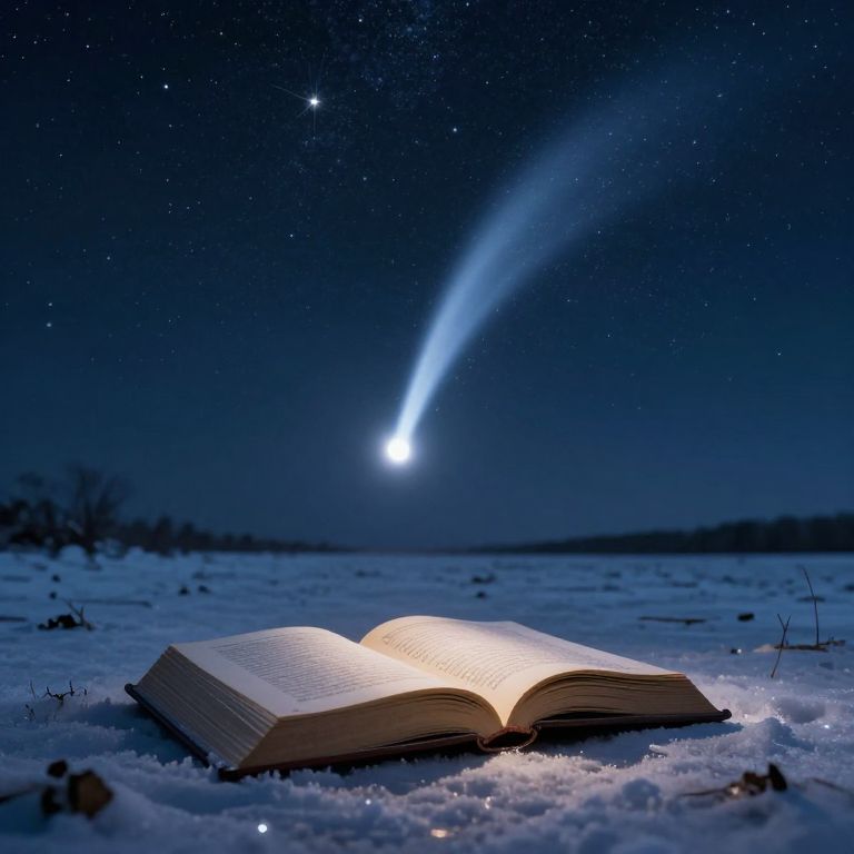 Photograph of an open book lying on a snow-covered field at night, illuminated by a bright comet with a long, glowing tail in a star-filled, dark blue sky. The book's pages glow softly, contrasting with the cold, white snow. In the background, the horizon is faintly visible, with bare trees silhouetted against the night. The scene evokes a sense of magical, otherworldly wonder, blending natural elements with an astronomical event. The comet's light casts a subtle reflection on the snow, enhancing the ethereal atmosphere.