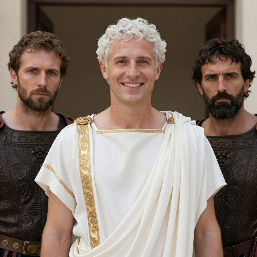 Photograph of a smiling man with short, curly, white hair and fair skin, wearing a white Roman-style toga with gold accents. Flanking him are two men with serious expressions; the man on the left has brown hair and beard, while the man on the right has dark hair and a beard. They're all standing in a doorway with neutral-colored walls in the background.