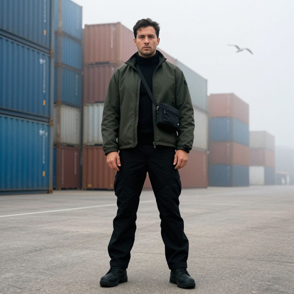A man, dark olive green softshell jacket, black merino wool turtleneck, straight-leg black tactical pants, durable black combat boots, streamlined black crossbody bag, foggy morning haze, distant seagulls calling, massive containers stacked high, kodachrome analog film, focused expression. Man has masculine face and piercing eyes