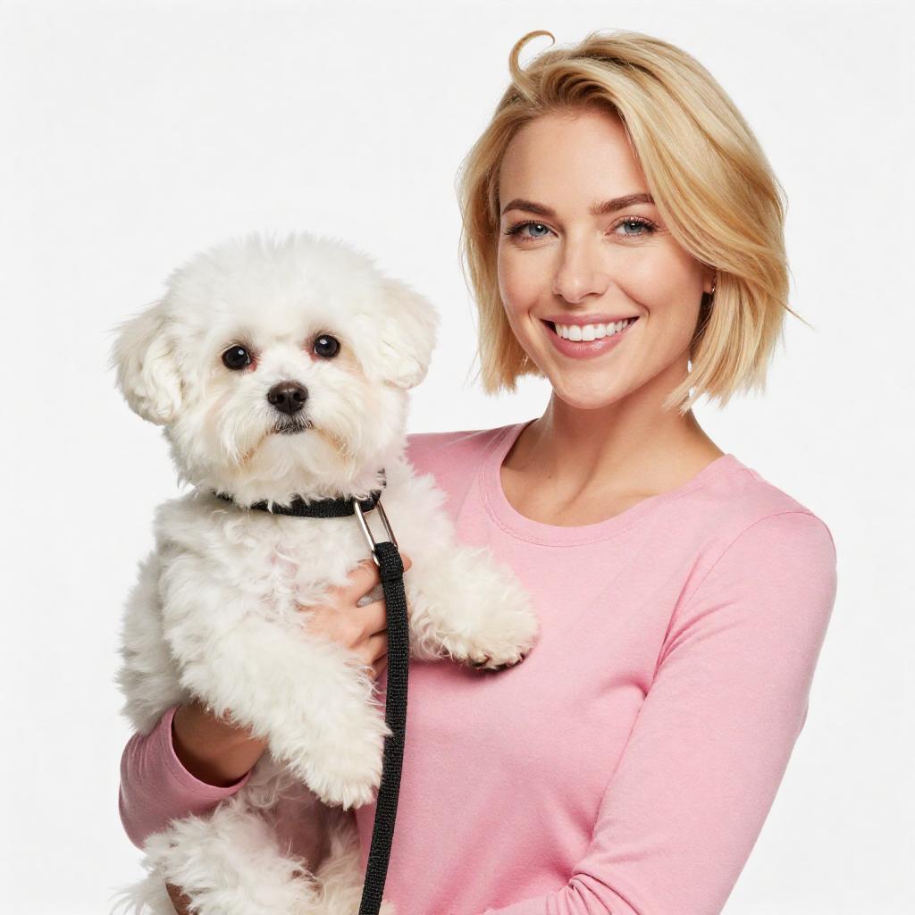 Photograph of a smiling blonde woman with a short bob haircut, wearing a pink long-sleeve top, holding a small white Maltese dog with a black nose and leash in her left arm. Bright white background. Woman stands on the right, dog on the left. Woman's hair has a small upward curl on top.